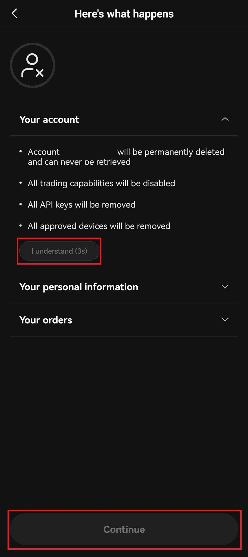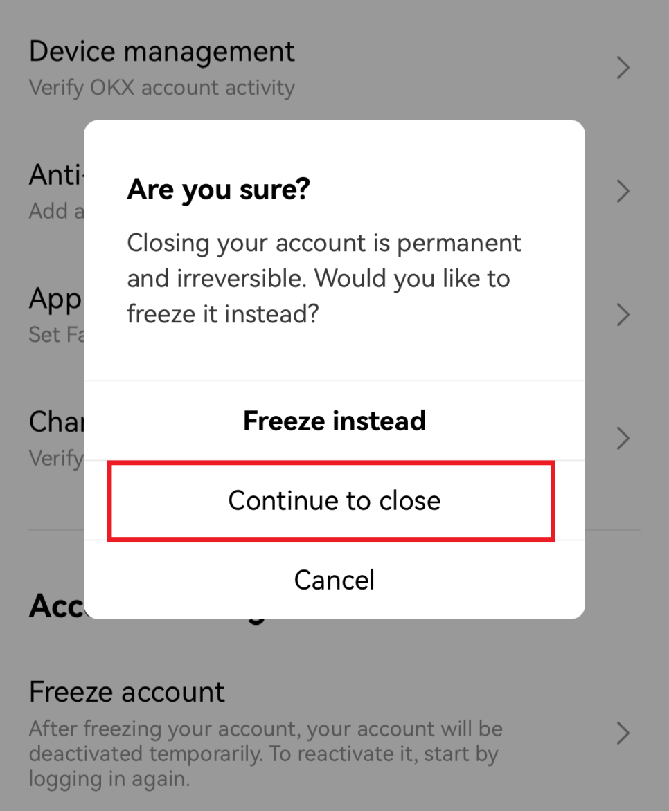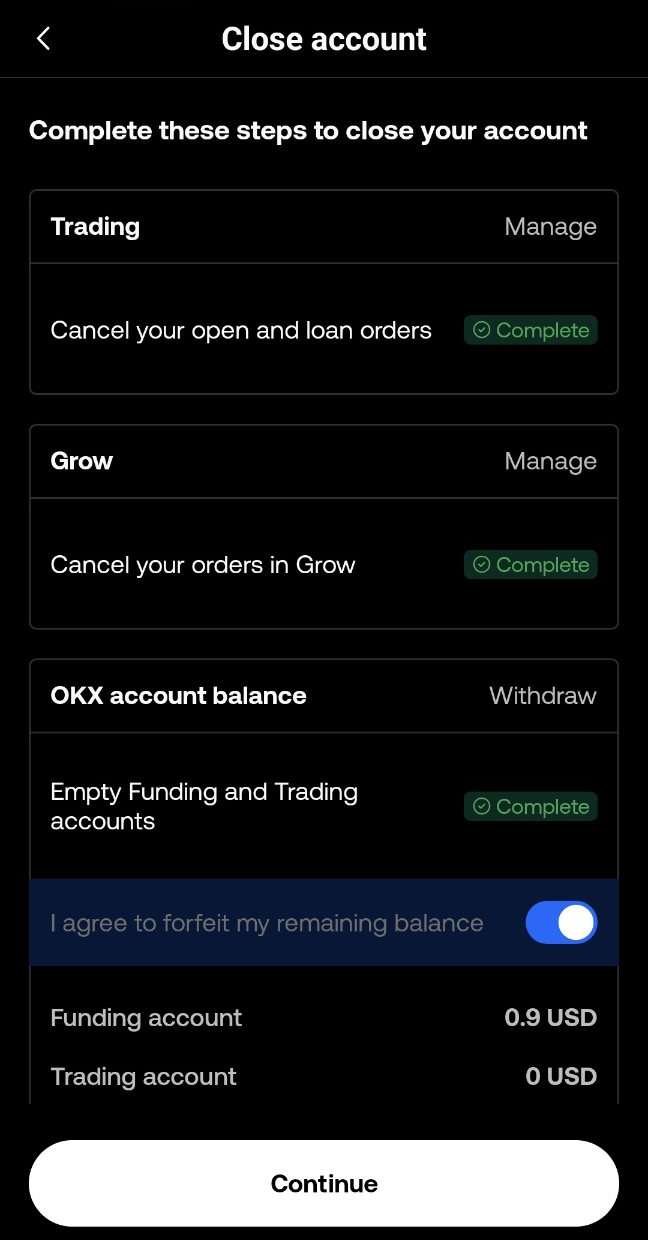 6️⃣ 계정을 닫는 이유는 Other Reasons 를 선택> Continue ➡Continue to close 선택